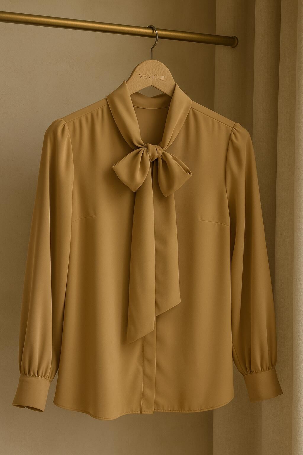 Modern zarafet ile klasik şıklığı birleştiren Ventiup fiyonk yaka karamel bluz, her stile sofistike bir dokunuş katar.