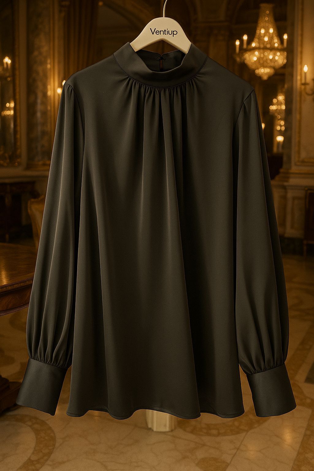 Ventiup Luxe Dökümlü Balon Kol İpek Saten Bluz – Siyah
