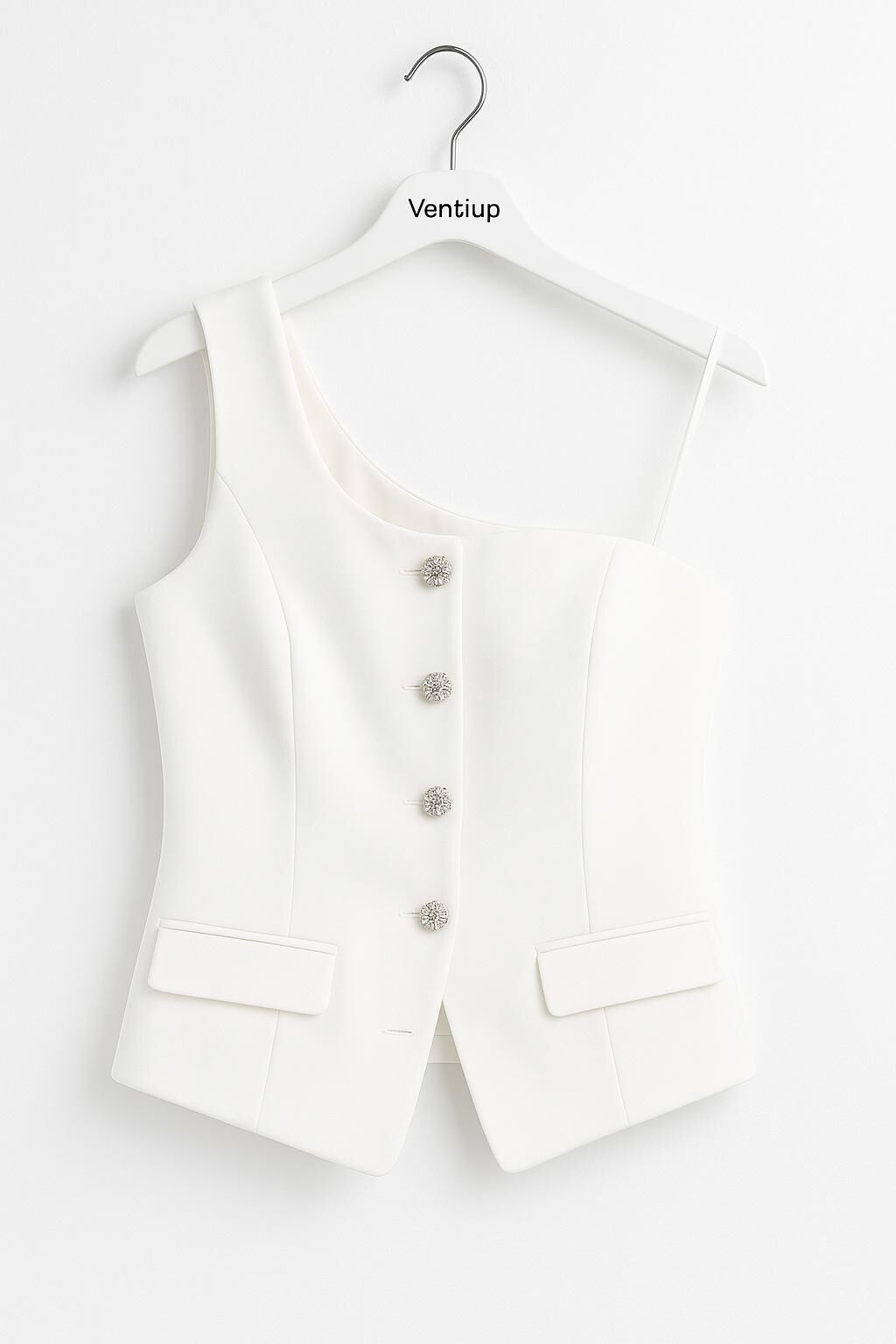 Beyaz Asimetrik Tek Omuz Kristal Düğmeli Yelek Büstiyer