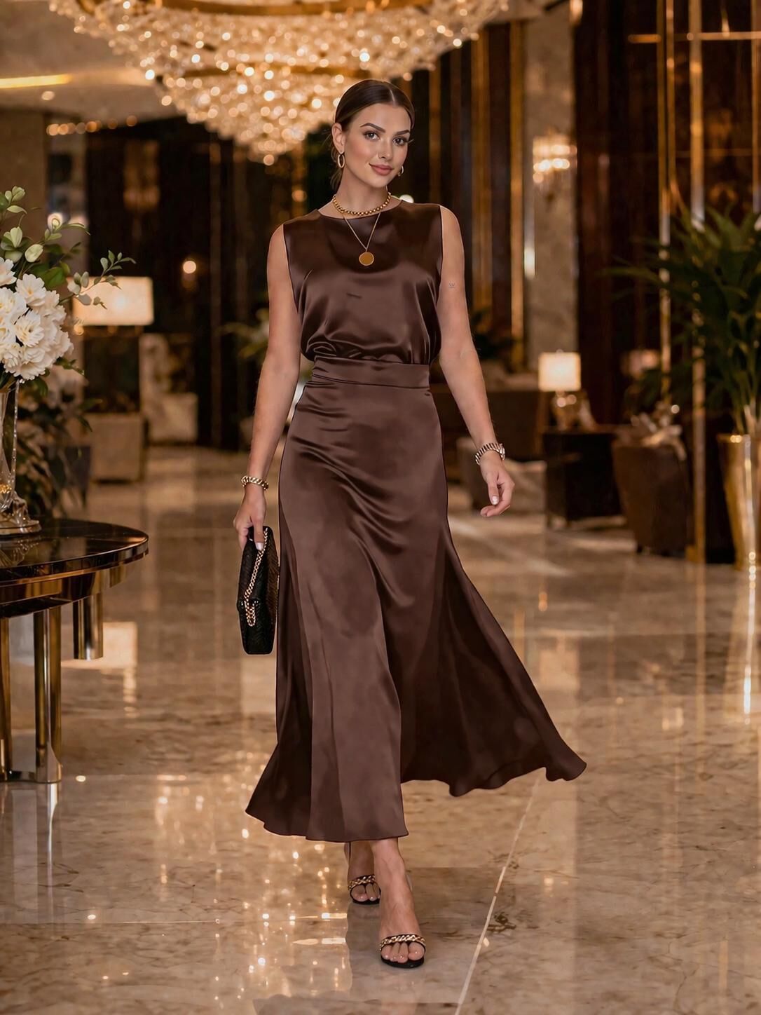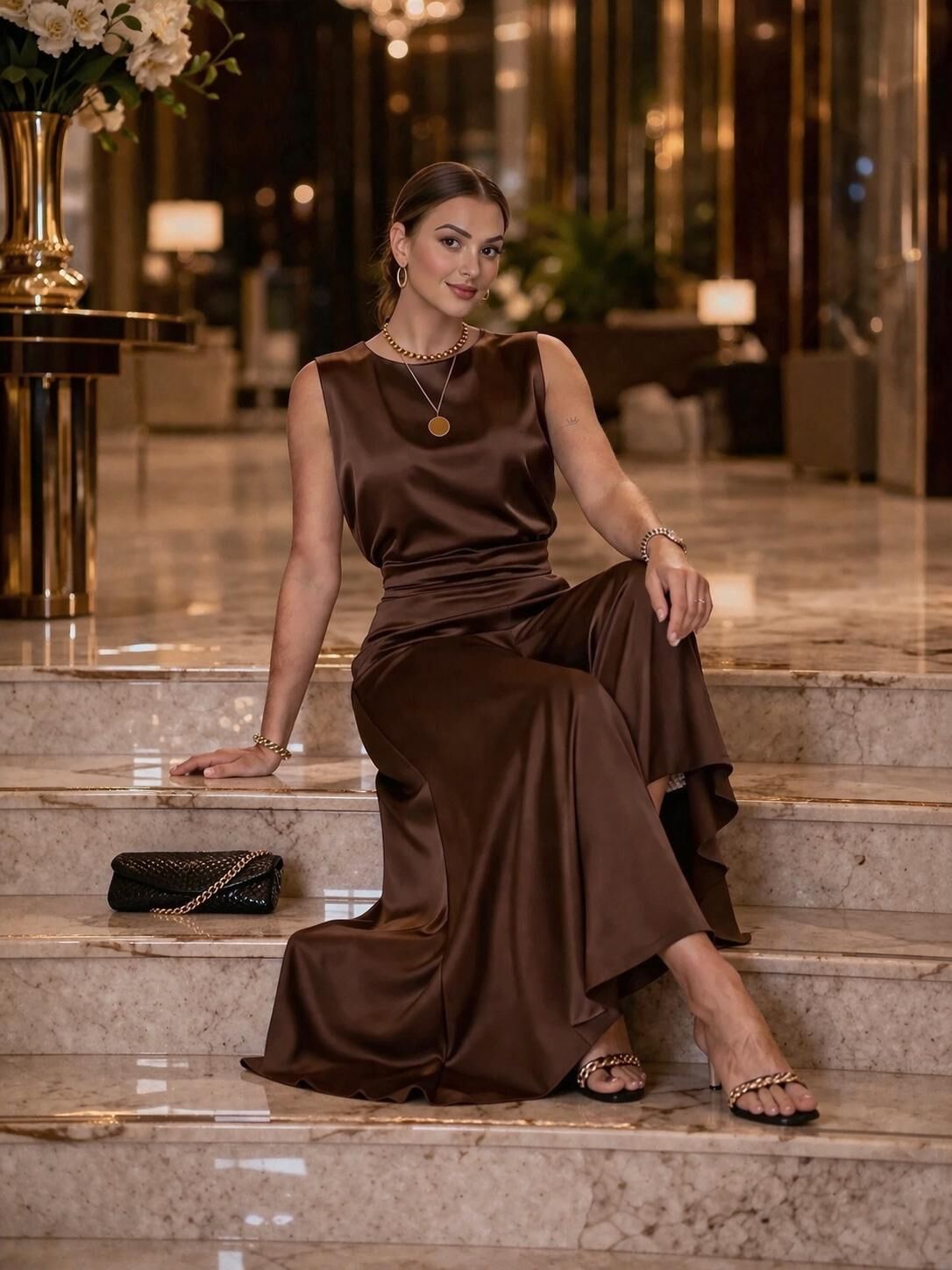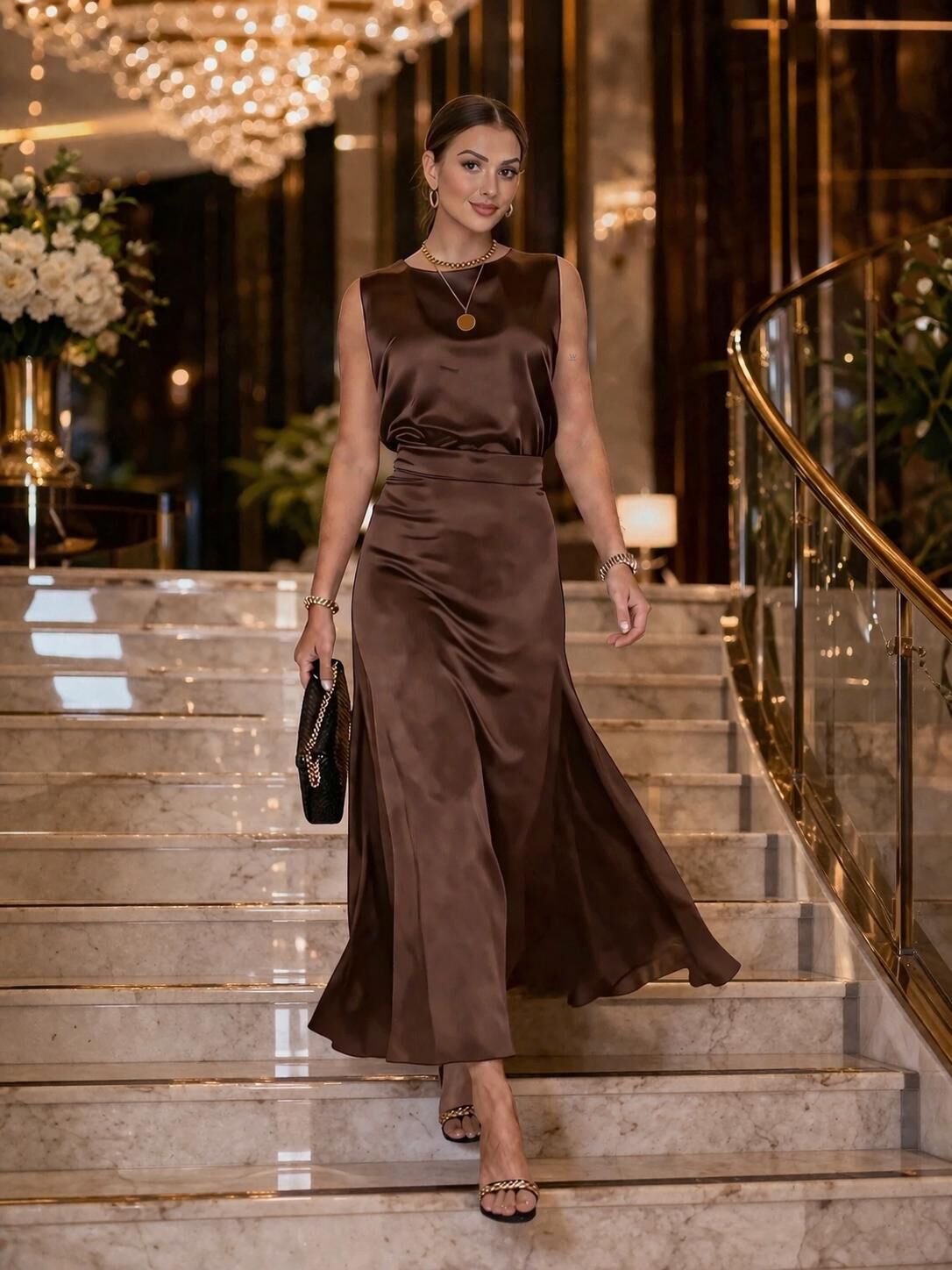 Kloş kesimin verdiği akış ve hacim sayesinde yürürken etkileyici bir siluet oluşturur. İpek saten dokusu ile tek parça halinde bile güçlü ve lüks bir görünüm sağlar.