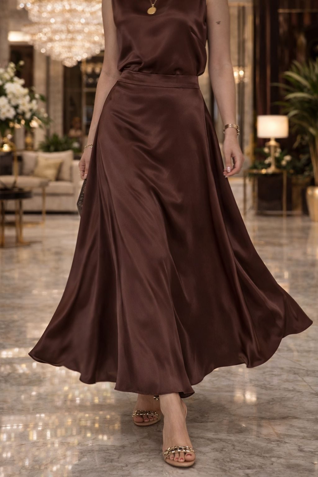 Çikolata İpek Saten Yüksek Bel Kloş Etek