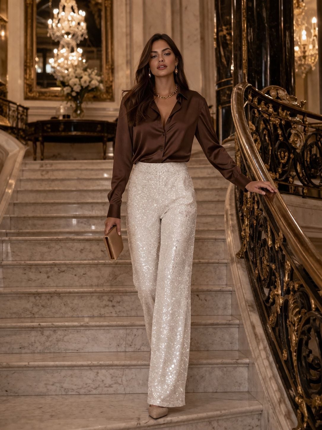 Işıltıyı cesaretle buluşturan Eliza payetli pantolon, özel günlerde ve gece davetlerinde tüm bakışları üzerinize çekecek. Yüksek belli ve geniş paçalı kesimiyle hem modern hem de şık bir duruş sunar. Parlak beyaz payet detayları, güçlü bir stil yansıması için tasarlandı. Yandan cepli yapısıyla fonksiyonel bir şıklık sunarken, 1.18 cm uzunluğundaki boyu topuklu ayakkabılarla kusursuz uyum sağlar. Eliza ile gecenin yıldızı siz olun.