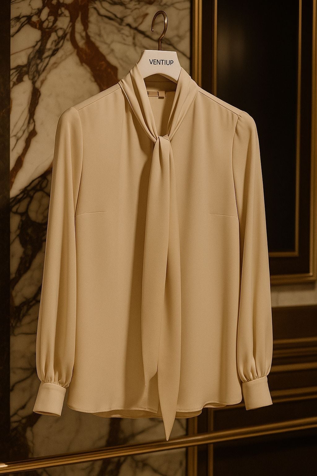 Zamansız bir zarafetle tasarlanan Ventiup fiyonk yaka saten bluz, bej rengin sıcak ve sofistike tonlarıyla her stile zarif bir dokunuş katar.