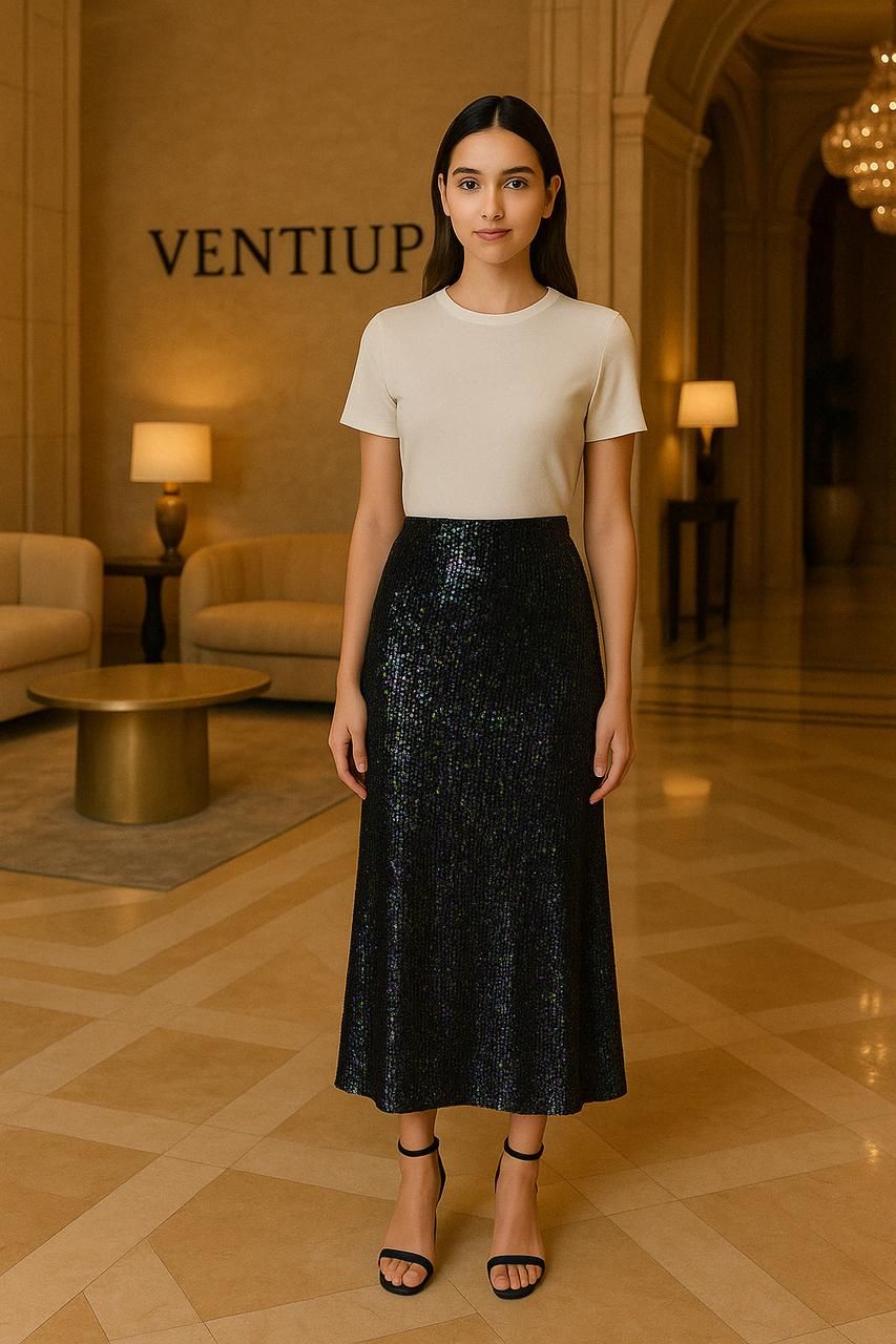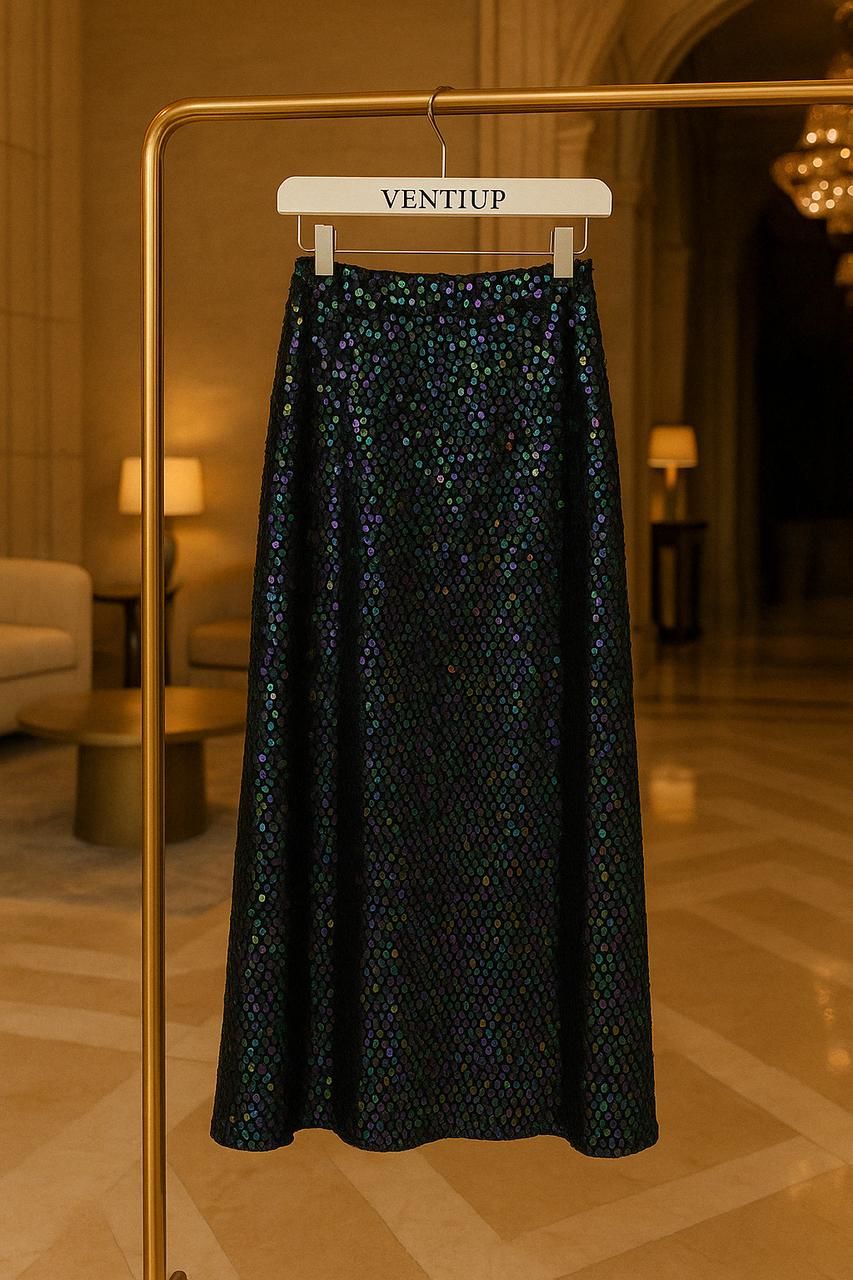 Noir Etek, siyah üzerine yansıyan holografik tonlardaki payetleriyle ışıkla dans eden özel bir parçadır. A-kesimiyle zarif bir siluet sunarken, yüksek beli ve midi boyuyla feminenliği sofistike bir duruşla buluşturur. Işıltılı ama sade tasarımı sayesinde hem günlük şıklıkta hem özel davetlerde rahatlıkla kullanılabilir. Ventiup Luxe kadınının modern ve cesur tarzını yansıtır.