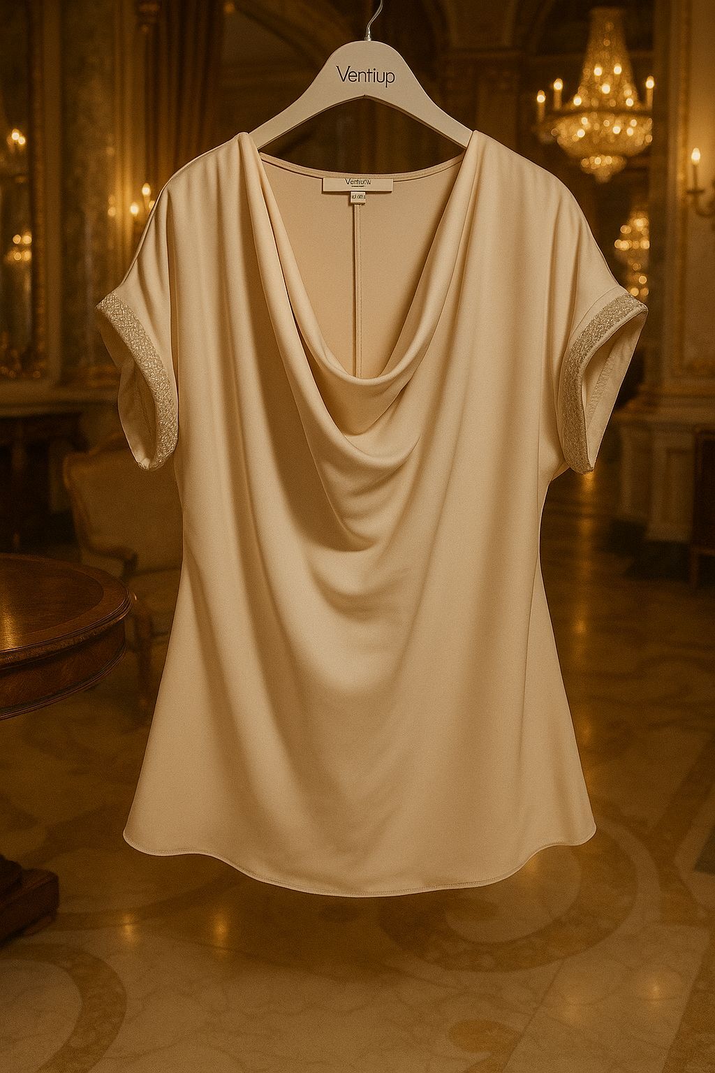 Zarafetin en sade hâlini yansıtan Ventiup Luxe Şampanya Dökümlü Yaka Bluz, akıcı iepk krep kumaşı ve ışıltılı taş detaylarıyla özel günlerde ve davetlerde sofistike bir duruş sunar. Dökümlü yakası feminen bir zarafet katarken, kollarındaki taş işlemeleri modern bir lüks dokunuş yaratır.